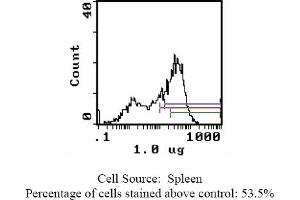 - FLOW CYTOMETRY ANALYSIS: Method: 1. Prepare a cell suspension in media A. For cell preparations, deplete the red blood cellpopulation with Rat cell separation medium. 2. Wash 2 times. 3. Resuspend the cells to a concentration of 2x10e7 cells/ml in media A. Add 50 µl of thissuspension to each tube (each tube will then contain 1x10e6 cells, representing 1 test). 4. To each tube, add 1. 0-0. 5 µg* of ABIN114366 or ABIN114366X. 5. Vortex the tubes to ensure thorough mixing of antibody and cells. 6. Incubate the tubes for 30 minutes at 4°C. 7. Wash 2 times at 4°C. 8. Add 100 µl of secondary antibody (FITC Goat anti-mouse IgG (H+L)) at 1: 500 dilution. 9. Incubate the tubes at 4°C for 30-60 minutes. (It is recommended that the tubes are protected from light since most fluorochromes arelight sensitive). 10. Wash 2 times at 4°C in media B. 11. Resuspend the cell pellet in 50 µl ice cold media B. 12. Transfer to suitable tubes for flow cytometric analysis containing 15 µl of propidiumiodide at 0. 5 mg/ml in PBS. This stains dead cells by intercalating in DNA. Media: A. Phosphate buffered saline (pH 7. 2) + 5% normal serum of host species + sodium azide(100 µl of 2M sodium azide in 100 mls). B. Phosphate buffered saline (pH 7. 2) + 0. 5% Bovine serum albumin + sodium azide (100µl of 2M sodium azide in 100 mls). Results-Tissue Distribution: Rat Strain: WistarCell Concentration: 1 x 10e6 cells per testsAntibody Concentration Used: 0. 2 µg/10e6 cellsIsotypic Control: Mouse IgG2a. Cell Source-Percentage of cells stained above control: Thymus: 82. 1%Spleen: 53. 5%Lymph Node: 87. 1%N. B. Appropriate control samples should always be included in any labelling studies. * For optimal results in various applications, it is recommended that each investigatordetermine dilutions appropriate for individual use.