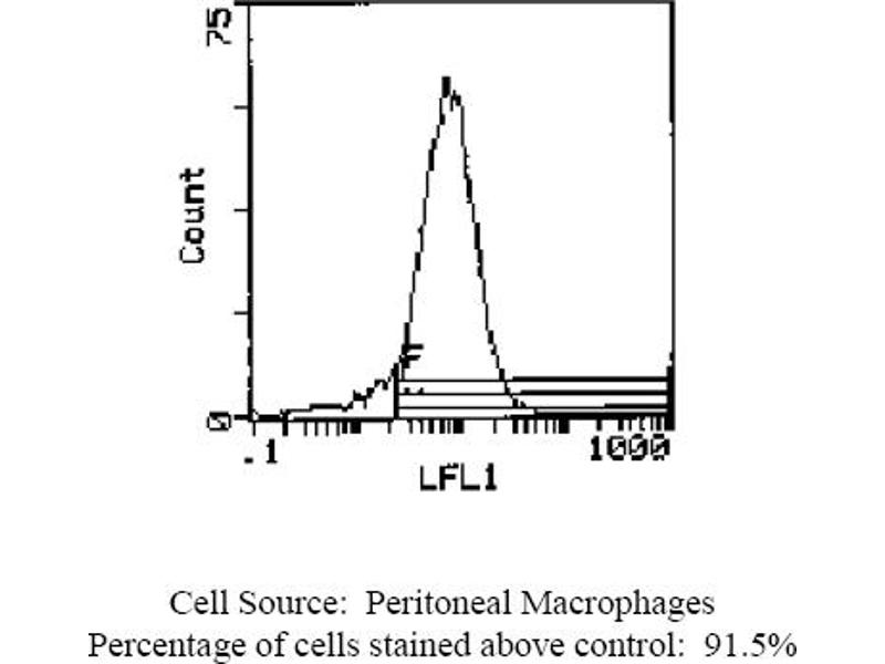 FLOW CYTOMETRY ANALYSIS: Method: 1. Prepare a cell suspension in media A. For cell preparations, deplete the red blood cellpopulation with Lympholyte®-Rat cell separation medium. 2. Wash 2 times. 3. Resuspend the cells to a concentration of 2x10e7 cells/ml in media A. Add 50 µl of thissuspension to each tube (each tube will then contain 1 x 10e6 cells, representing 1 test). 4. To each tube, add 1. 0 µg of this Ab per 10e6 cells. 5. Vortex the tubes to ensure thorough mixing of antibody and cells. 6. Incubate the tubes for 30 minutes at 4°C. 7. Wash 2 times at 4°C. 8. Add 100 µl of secondary antibody (Streptavidin-FITC) at a 1: 500 dilution. 9. Incubate tubes at 4°C for 30 - 60 minutes (It is recommended that tubes are protectedfrom light since most fluorochromes are light sensitive). 10. Wash 2 times at 4°C. 11. Resuspend the cell pellet in 50 µl ice cold media B. 12. Transfer to suitable tubes for flow cytometric analysis containing 15 µl of propidiumiodide at 0. 5 mg/ml in PBS. This stains dead cells by intercalating in DNA. Media: A. Phosphate buffered saline (pH 7. 2) + 5% normal serum of host species + sodium azide(100 µl of 2M sodium azide in 100 mls). B. Phosphate buffered saline (pH 7. 2) + 0. 5% Bovine serum albumin + sodium azide (100µl of 2M sodium azide in 100 mls). Results - Tissue Distribution: Rat Strain: WistarCell Concentration: 1x10e6 cells per testAntibody Concentration Used: 1. 0 µg/10e6 cellsIsotypic Control: Biotin Mouse IgG1. Cell Source Percentage of cells stained above control: Peritoneal Macrophages: 91. 5%Thymus: 8. 9%Results - Strain Distribution: Antibody Concentration Used: 1. 0 µg/10e6 cellsStrains Tested: Wistar, Brown Norway, Buffalo, Fischr 344Positive: Wistar, Brown Norway, Buffalo, Fischr 344Negative: none