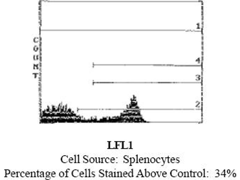 FLOW CYTOMETRY ANALYSIS: METHOD: 1. Prepare cell suspension in media A. For cell preparations, deplete the red blood cellpopulation with Lympholyte®-Rat. cell separation medium. 2. Wash 2 times. 3. Resuspend cells to 1x10e6 cells in approximately 50 µl media A in a microcentrifugetube. (i. e. 50 µl of cells resuspended to 2x10e7 cells/ml). The contents of 1 tube represent 1test. 4. To each tube add 50 µl of a 1: 250 - 1: 500 dilution of this Ab. 5. Vortex the tubes to ensure thorough mixing of antibody and cells. 6. Incubate the tubes for 30 minutes at 4°C. 7. Wash 2 times at 4°C. 8. Add 100 µl of secondary antibody (FITC Goat anti-mouse IgG (H+L)) at 1: 700 dilution. 9. Incubate tubes at 4°C for 30-60 minutes. (It is recommended that the tubes areprotected from light since most fluorochromes are light sensitive). 10. Wash 2 times at 4°C in Media B. 11. Resuspend the cell pellet in 50 µl ice cold Media B. 12. Transfer to suitable tubes for flow cytometric analysis containing 15 µl of propidiumiodide at 0. 5 mg/ml in phosphate buffered saline. (This stains dead cells by intercalatingDNA). MEDIA: A. Phosphate buffered saline (pH 7. 2) + 5% normal serum of host species + sodium azide(100 µl of 2 M sodium azide in 100 mls). B. Phosphate buffered saline (pH 7. 2) + 0. 5% bovine serum albumin + sodium azide (100 µlof 2 M sodium azide in 100 mls). RESULTS: Rat Strain: Lewis RatCell Concentration: 1x10e6 cells per testAntibody Concentration: 1: 400Isotypic Control: Mouse IgG1, κCELL SOURCE PERCENT STAININGThymus 12%Spleen 34%Lymph Node 25%STRAIN DISTRIBUTION: Antibody Concentration: 1: 100Strains Tested: Wistar, Buffalo, Brown Norway, Fischer 344Positive: Wistar, Buffalo, Brown Norway, ACI, Fischer 344Negative: none
