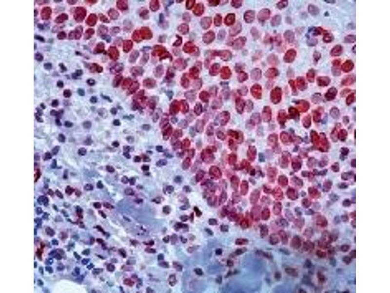Immunohistochemistry on Formalin-Fixed Paraffin Embedded Sections: 1/25-1/50 in an ABCmethod for 30 minutes at room temperature. Formalin fixed paraffin embedded tissue sections require high temperature antigenunmasking with 10 mM citrate buffer, pH 6.0 prior to immunostaining. Recommended Positive Control: Tonsil, Breast carcinoma.