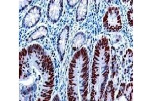 Immunoprecipitation. Western Blot: 1/100-1/500. Immunohistochemistry on Formalin-Fixed Paraffin Embedded Sections: 1/25-1/50 in an ABCmethod (30 to 60 minutes at room temperature (requires high temperature antigenunmasking with 10 mM citrate buffer, pH 6.0 prior to immunostaining). Immunohistochemistry on Frozen Sections. Recommended Positive Control: Tonsil, colon carcinoma