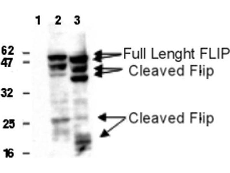 FLIP is an apoptosis regulator protein which functions as a crucial link between cell survival and cell death pathways in mammalian cells and acts as an inhibitor of TNFRSF6 mediated apoptosis. A proteolytic fragment (p43) is likely retained in the death-inducing signaling complex (DISC) thereby blocking further recruitment and processing of caspase-8 at the complex. Full length and shorter isoforms have been shown either to induce apoptosis or to reduce TNFRSF-triggered apoptosis. FLIP lacks enzymatic (caspase) activity. FLIP is highly expressed in skeletal muscle, pancreas, heart, kidney, placenta and peripheral blood leukocytes.