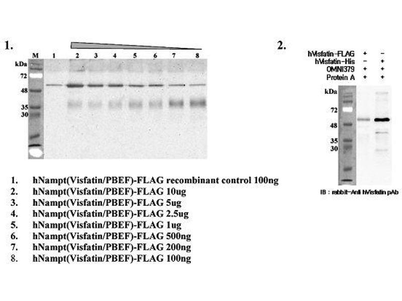 Nicotinamide phosphoribosyltransferase (Nampt, pre-B cell colony-enhancing factor, PBEF, Visfatin) is an 52 kDa adipokine secreted by adipose tissue and involved in the biosynthesis of nicotinamide adenine dinucleotide (NAD+). Two forms of Nampt exist, an intracellular form (iNampt) and an extracellular form (eNampt). While the function of iNampt as an essential and rate-limiting NAD+ biosynthetic enzyme is well established, the physiological role of eNampt is still a matter of debate. Nampt has various functions, including the promotion of vascular smooth muscle cell maturation and inhibition of neutrophil apoptosis. It activates insulin receptor and has insulin-mimetic effects, lowering blood glucose and improving insulin sensitivity. The protein is highly expressed in visceral fat and serum levels of the protein correlate with obesity.