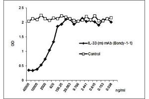 - Interleukin-33 (IL-33, HF-NEV, IL-1F11), a member of the IL-1 family of cytokines, is expressed by many cell types following pro-inflammatory stimulation and is thought to be released upon cell lysis. IL-33 binds to and signals through ST2 (IL-1R1) and its stimulation recruits MYD88, IRAK, IRAK4 and TRAF6, followed by phosphorylation of ERK1 (MAPK3)/ERK2 (MAPK1), p38 (MAPK14) and JNK. The ability of IL-33 to target numerous immune cell types, like Th2-like cells, mast cells and B1 cells, and to induce cytokine and chemokine production underlines its potential in influencing the outcome of a wide range of diseases, such as arthritis, asthma, atopic allergy & anaphylaxis, cardiovascular disease/atherosclerosis, nervous system diseases and sepsis. Anti-IL-33, mAb (recombinant) (blocking) (Bondy-1-1) is an antibody developed by antibody phage display technology using a human naive antibody gene library. These libraries consist of scFv (single chain fragment variable) composed of VH (variable domain of the human immunoglobulin heavy chain) and VL (variable domain of the human immunoglobulin light chain) connected by a polypeptide linker. The antibody fragments are displayed on the surface of filamentous bacteriophage (M13). This scFv was selected by affinity selection on antigen in a process termed panning. Multiple rounds of panning are performed to enrich for antigen-specific scFv-phage. Monoclonal antibodies are subsequently identified by screening after each round of selection. The selected monoclonal scFv is cloned into an appropriate vector containing a Fc portion of interest and then produced in mammalian cells to generate an IgG like scFv-Fc fusion protein.