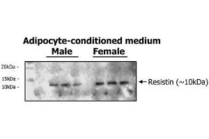 The adipocytokine resistin which belongs to a family of cysteine-rich C-terminal proteins known as resistin-like molecules (RELM, RELMalpha/FIZZ 1 and RELMbeta/FIZZ 2) of FIZZ (found in inflammatory zone) are thought to be involved in inflammatory processes. Previous studies in mice showed that resistin impairs glucose tolerance and insulin action. In addition, resistin also inhibits adipogenesis in murine 3T3-L1 cells. Therefore resistin has also been proposed as an adipocyte-secreted factor thought to link obesity and T2DM.