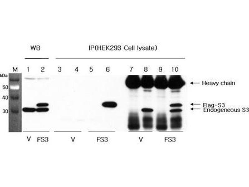 RpS3 is a component of the 40S ribosomal subunit and is an an essential but previously unkown subunit of NF-kappaB involved in the regulation of key genes in rapid cellular activation responses. RpS3 interacts with nm23-H1. The expression of rpS3 reduces the secretion of MMP-9 and the invasive metastatic potential in HT1080 cells. The phosphorylated ERK is reduced by the expression of rpS3.
