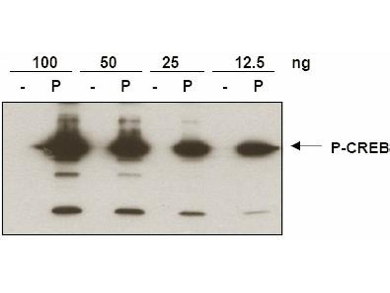 This phospho specific polyclonal antibody reacts with phosphorylated human CREB at pS133 and shows minimal reactivity by western blot with non-phosphorylated CREB and minimal reactivity by ELISA against the non-phosphorylated form of the immunizing peptide. This product was affinity purified from monospecific antiserum by immunoaffinity purification. Antiserum was first sequentially pre-adsorbed against a control E.coli lysate, nickel-purified recombinant CREB and the non-phosphorylated form of the immunizing peptide. The resultant depleted antiserum was then purified against the phosphorylated form of the immunizing peptide. This phospho specific polyclonal antibody is specific for phosphorylated pS133 of human CREB. Reactivity with non-phosphorylated CREB is minimal. This antibody does show cross reactivity with pS133 phosphorylated CREB from mouse and rat.
