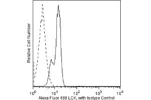 Lck is a member of the Src family of cytoplasmic protein-tyrosine kinases (PTKs) that is normally expressed exclusively in lymphoid cells, primarily T lymphocytes and NK cells. A low level of expression has been detected in B lymphocytes, but its function in B cells is unknown. Its expression in other leukocytes is not well defined. Members of the Src family have several common features: 1) unique N-terminal domains, 2) attachment to cellular membranes through a myristylated N-terminus, and 3) homologous SH2, SH3, and catalytic domains. The unique N-terminal domain of Lck interacts with the cytoplasmic tails of the CD4 and CD8 cell-surface glycoproteins of T lymphocytes, which recognize antigen presenting cells via their surface MHC class II and class I molecules, respectively. The catalytic activity of Lck is regulated by both kinases and phosphatases that control the phosphorylation states of two tyrosine residues that have opposing effects. Repression of Lck's catalytic activity occurs via phosphorylation at tyrosine 505 (Y505), located near the carboxy terminus. Phosphorylation of this tyrosine site is mediated by the Csk family of PTKs, and its dephosphorylation is mediated by the protein tyrosine phosphatase, CD45. When Lck is phosphorylated at this site, it assumes a folded tertiary structure which is enzymatically inactive. When CD45 dephosphorylates it at Y505, Lck is able to autophosphorylate its Y394, which leads to conformational changes in the catalytic domain that induce kinase activity. However, it has been observed that the inhibitory effect of the phosphorylated Y505 can be overcome by direct engagement of Lck's SH3 domain and that both Y394 and Y505 are phosphorylated together in cells activated by hydrogen peroxide. Activated Lck phosphorylates the ITAMs (Immunoreceptor-based Tyrosine Activation Motifs) of the T cell receptor (TCR) and thus is critical for activation and development of T lymphocytes. The interactions of Lck, Csk, CD45, CD4 or CD8, and TCR are only a small part of a complex immunoregulatory cascade that involves additional substrates for Csk and CD45, other enzymes, adhesion molecules, adaptor proteins, and specialized membrane microdomains. The MOL 171 monoclonal antibody recognizes the 56- and 60-kDa forms of human Lck protein, regardless of phosphorylation status. It cross reacts with mouse Lck.