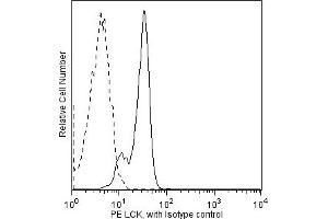 Lck is a member of the Src family of cytoplasmic protein-tyrosine kinases (PTKs) that is normally expressed exclusively in lymphoid cells, primarily T lymphocytes and NK cells. A low level of expression has been detected in B lymphocytes, but its function in B cells is unknown. Its expression in other leukocytes is not well defined. Members of the Src family have several common features: 1) unique N-terminal domains, 2) attachment to cellular membranes through a myristylated N-terminus, and 3) homologous SH2, SH3, and catalytic domains. The unique N-terminal domain of Lck interacts with the cytoplasmic tails of the CD4 and CD8 cell-surface glycoproteins of T lymphocytes, which recognize antigen presenting cells via their surface MHC class II and class I molecules, respectively. The catalytic activity of Lck is regulated by both kinases and phosphatases that control the phosphorylation states of two tyrosine residues that have opposing effects. Repression of Lck's catalytic activity occurs via phosphorylation at tyrosine 505 (Y505), located near the carboxy terminus. Phosphorylation of this tyrosine site is mediated by the Csk family of PTKs, and its dephosphorylation is mediated by the protein tyrosine phosphatase, CD45. When Lck is phosphorylated at this site, it assumes a folded tertiary structure which is enzymatically inactive. When CD45 dephosphorylates it at Y505, Lck is able to autophosphorylate its Y394, which leads to conformational changes in the catalytic domain that induce kinase activity. However, it has been observed that the inhibitory effect of the phosphorylated Y505 can be overcome by direct engagement of Lck's SH3 domain and that both Y394 and Y505 are phosphorylated together in cells activated by hydrogen peroxide. Activated Lck phosphorylates the ITAMs (Immunoreceptor-based Tyrosine Activation Motifs) of the T cell receptor (TCR) and thus is critical for activation and development of T lymphocytes. The interactions of Lck, Csk, CD45, CD4 or CD8, and TCR are only a small part of a complex immunoregulatory cascade that involves additional substrates for Csk and CD45, other enzymes, adhesion molecules, adaptor proteins, and specialized membrane microdomains. The MOL 171 monoclonal antibody recognizes the 56- and 60-kDa forms of human Lck protein, regardless of phosphorylation status. It cross reacts with mouse Lck.