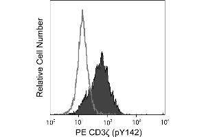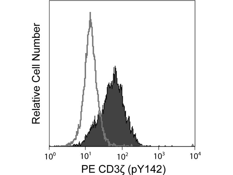 The T cell receptor (TCR), expressed by thymocytes and T lymphocytes, is a multi-component cell-surface complex responsible for recognizing antigen in the context of MHC molecules. The antigen-specific binding component of the TCR, Ti, is a heterodimer of the variable Ig-like subunits a and b or g and d. Ti is non-covalently associated with an invariant set of molecules referred to as the CD3 polypeptides, g, d, e, and zeta. The CD3 z polypeptide (CD3z) was named CD247 at the 7th Human Leukocyte Differentiation Antigens Workshop. CD3 appears early in thymocyte differentiation and remains expressed on all mature T lymphocytes. After antigen recognition by the TCR, CD3z is the primary intracellular signal transducing subunit. It contains three ITAMs (Immunoreceptor Tyrosine-based Activation Motifs), each of which contains a pair of tyrosine residues that are phosphorylated by Lck and Fyn and are required for signal propagation. The molecular weight of CD3z is 16 kDa, and it is also observed as 32-kDa homodimers or as heterodimers with the g chain of Fc receptors. Upon phosphorylation, the CD3z monomer undergoes an apparent shift in electrophoretic mobility up to 21 kDa. The K25-407.69 monoclonal antibody recognizes the phosphorylated tyrosine 142 (pY142) in the third ITAM domain of human CD3z (CD247). Synonyms: CD3zeta