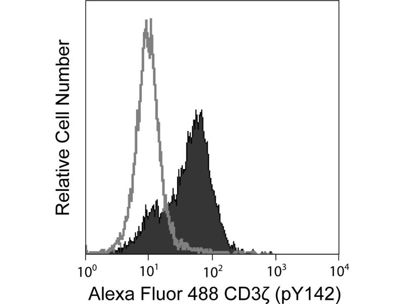 The T cell receptor (TCR), expressed by thymocytes and T lymphocytes, is a multi-component cell-surface complex responsible for recognizing antigen in the context of MHC molecules. The antigen-specific binding component of the TCR, Ti, is a heterodimer of the variable Ig-like subunits a and b or g and d. Ti is non-covalently associated with an invariant set of molecules referred to as the CD3 polypeptides, g, d, e, and zeta. The CD3 z polypeptide (CD3z) was named CD247 at the 7th Human Leukocyte Differentiation Antigens Workshop. CD3 appears early in thymocyte differentiation and remains expressed on all mature T lymphocytes. After antigen recognition by the TCR, CD3z is the primary intracellular signal transducing subunit. It contains three ITAMs (Immunoreceptor Tyrosine-based Activation Motifs), each of which contains a pair of tyrosine residues that are phosphorylated by Lck and Fyn and are required for signal propagation. The molecular weight of CD3z is 16 kDa, and it is also observed as 32-kDa homodimers or as heterodimers with the g chain of Fc receptors. Upon phosphorylation, the CD3z monomer undergoes an apparent shift in electrophoretic mobility up to 21 kDa. The K25-407.69 monoclonal antibody recognizes the phosphorylated tyrosine 142 (pY142) in the third ITAM domain of human CD3z (CD247). Synonyms: CD3zeta