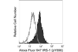 The IRS (Insulin Receptor Substrate) proteins IRS-1, IRS-2, IRS-3, and IRS-4 are major substrates of the insulin receptor and the insulin-like growth factor-1 (IGF-1) receptor tyrosine kinases. IRS proteins contain an N-terminal pleckstrin homology (PH) domain, a phosphotyrosine-binding (PTB) domain, and multiple tyrosine phosphorylation sites in the C-terminus. The IRS-1 protein is widely expressed and, along with IRS-2, mediates somatic growth and carbohydrate metabolic responses to insulin. Following insulin receptor ligation, IRS-1 binds to the juxtamembrane region of the receptor via the PH and PTB domains and is tyrosine phosphorylated, which facilitates its interaction with SH2 domain-containing signaling proteins. Specifically, the phosphorylated tyrosine 896 (pY896) of human IRS-1 is a major binding site for the GRB2 (Growth-factor Receptor-Bound protein 2) adaptor protein. After IRS-1 activation, negative and positive feedback regulates dephosphorylation of its tyrosine sites, which ultimately regulates the magnitude and/or duration of the downstream pleiotropic responses to insulin and IGF-1. The K9-211 monoclonal antibody recognizes pY896 of human IRS-1. The orthologous phosphorylation sites of mouse and rat IRS-1 are Y891 and Y895, respectively.