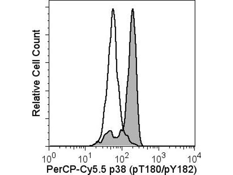 Activation of the immune and inflammatory responses often involves the recognition of bacterial endotoxin (lipopolysaccharide or LPS). Binding of LPS by monocytes results in the production and release of proinflammatory cytokines, such as IL-1 and TNF. LPS-induced signaling cascades involve members of the Ser/Thr protein kinase family known as the Mitogen Activated Protein Kinases (MAPKs). MAPK signal transduction pathways mediate the effects of various extracellular stimuli on biological processes such as proliferation, differentiation, and death. The p38 MAPKs include p38alpha (MAPK14), beta (MAPK11), gamma (MAPK12), and delta (MAPK13). These Ser/Thr kinases are activated by dual phosphorylation on threonine (T) and tyrosine (Y) within the motif Thr-Gly-Tyr located in kinase subdomain VIII. Activation of p38 MAPK is mediated specifically by the MAP Kinase Kinases, MKK3, MKK4, and MKK6. This leads to the activation of multiple transcription factors (NF-kappaB, ATF-2, Elk-1, and CHOP) that induce expression of many different genes, including proinflammatory cytokine genes. Thus, p38 MAPKs are central kinases in multiple signal transduction pathways. The 36/p38 (pT180/pY182) monoclonal antibody recognizes the conserved dual phosphorylated site pT180/pY182 of p38alpha, beta, gamma, and delta. Synonyms: MK14, 11, 12, 13, CSBP1, SAPK2, 2A, 3, 4, MX12, ERK-6, ERK5