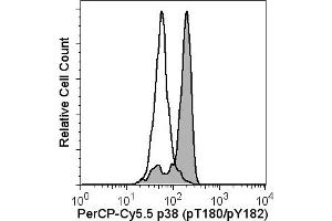 Activation of the immune and inflammatory responses often involves the recognition of bacterial endotoxin (lipopolysaccharide or LPS). Binding of LPS by monocytes results in the production and release of proinflammatory cytokines, such as IL-1 and TNF. LPS-induced signaling cascades involve members of the Ser/Thr protein kinase family known as the Mitogen Activated Protein Kinases (MAPKs). MAPK signal transduction pathways mediate the effects of various extracellular stimuli on biological processes such as proliferation, differentiation, and death. The p38 MAPKs include p38alpha (MAPK14), beta (MAPK11), gamma (MAPK12), and delta (MAPK13). These Ser/Thr kinases are activated by dual phosphorylation on threonine (T) and tyrosine (Y) within the motif Thr-Gly-Tyr located in kinase subdomain VIII. Activation of p38 MAPK is mediated specifically by the MAP Kinase Kinases, MKK3, MKK4, and MKK6. This leads to the activation of multiple transcription factors (NF-kappaB, ATF-2, Elk-1, and CHOP) that induce expression of many different genes, including proinflammatory cytokine genes. Thus, p38 MAPKs are central kinases in multiple signal transduction pathways. The 36/p38 (pT180/pY182) monoclonal antibody recognizes the conserved dual phosphorylated site pT180/pY182 of p38alpha, beta, gamma, and delta.