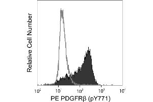 Platelet-derived growth factor (PDGF) is a potent mitogen for cells of mesenchymal origin and exerts its effects by binding to the PDGF receptor (PDGFR), a transmembrane protein tyrosine kinase. PDGFR is composed of PDGFRalpha (CD140a) and/or PDGFRbeta (CD140b) polypeptides. Both PDGF and PDGFR consist of subunits that form homo- or heterodimers with varying specificities: PDGF-AA binds only to alphaalpha PDGFR, PDGF-AB binds to both alphaalpha and alphabeta PDGFR, and PDGF-BB binds to all three PDGFRs. Ligand binding induces dimerization and activation of the receptor. Upon activation, CD140b is phosphorylated at multiple tyrosine sites and, in turn, an intracellular phosphorylation cascade is initiated. PDGFR localizes primarily to membrane invaginations termed caveolae, compartments that are enriched in several of its downstream effectors, including phosphatidylinositol 3'-kinase, Src, and phospholipase C-gamma. The J23-1044 monoclonal antibody recognizes the phosphorylated tyrosine 771 (pY771) in the kinase insert domain of CD140b. pY771 interacts with GTPase-activating protein, a negative regulator of Ras, and weakly with Shc, which indirectly promotes the activation of Ras.