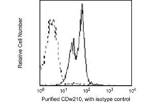 Reacts with 90-110 kDa protein expressed on T cells, B cells, NK cells, and monocyte/macrophages. It belongs to the class II cytokine receptor family which includes IFNgammaR (CDw119), IFNalpha/betaR (CD118) and tissue factor (CD142). IL-10R has been found to play a role in signal transduction by activating specific STAT proteins (STAT3 and STAT1) and inducing gene transcription. Other reports indicate that IL-10 protein binding to NK cells appears to be stimulatory, in contrast to its binding to T cells and monocytes/macrophages. Clone 3F9 is specific for human IL-10R and its binding to the receptor can be blocked by recombinant human IL-10 (rhIL-10).