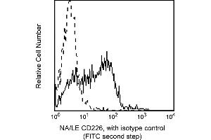 Reacts with DNAX accessory molecule-1 (DNAM-1), a 65 kDa transmembrane glycoprotein consisting of 318 amino acid residues including two Ig-like domains. DNAM-1 is expressed on the majority of T cells, NK cells, monocytes, and a subset of B cells, but not on granulocytes or erythrocytes. It is also present on a subset of thymocytes coexpressing high density surface CD3. DNAM-1 is not present on normal fibroblast cell lines or tumor cell lines of epithelial or neuronal origins. DNAM-1 is a tyrosinephosphorylated, signal-transducing molecule which participates in primary adhesion during cytotoxic T lymphocyte (CTL)-mediated cytotoxicity. DX11 inhibits T- and NKcell-mediated cytotoxicity against a variety of tumor cell targets, and blocks cytokine production by alloantigen-specific T cells. Synonyms: DNAM-1