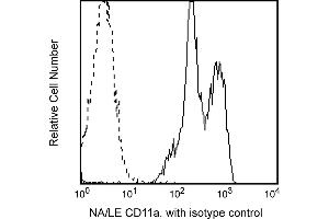The HI111 monoclonal antibody specifically binds to the 180 kDa integrin alpha chain. This type I transmembrane glycoprotein associates with CD18 (integrin beta2) to form the heterodimeric glycoprotein CD11a/CD18. This heterodimer is also known as the lymphocyte (leukocytes) function associated antigen-1 (LFA-1) that is expressed on all leukocytes. LFA-1 is an adhesion molecule involved in lymphocyte and granulocyte functions. LFA-1 mediates adhesion of lymphoid cells to the vascular endothelium in association with its ligand, and the intracellular adhesion molecule-1 (ICAM-1), CD54. Other ligands are ICAM-2 (CD102) and ICAM-3 (CD50). Synonyms: LFA-1alpha, Lymphocyte (Leukocyte) function-associated antigen 1 alpha chain, ITGAL