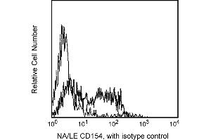 Reacts with CD40 ligand (CD40L), a 39 kDa type II membrane glycoprotein expressed on activated T cells. CD40-CD40L interaction plays a very important role in T cell-dependent B-cell proliferation, differentiation, and memory cell formation. Anti-CD40L mAb partially blocks T cell-B cell interaction affecting subsequent proliferation, differentiation, and memory cell formation. Anti-CD40L mAb partially blocks T cell-B cell interaction affecting subsequent proliferation, IL-2R expression and differentiation of B cells. In addition, blocking of CD40-CD40L interaction has been demonstrated with soluble CD40, resulting in the inhibition of immunoglobulin isotype switching. It has been reported that patients with X-linked hyper-IgM syndrome have defective expression of functional CD40L due to a defective gene that encodes CD40L. Synonyms: CD40L