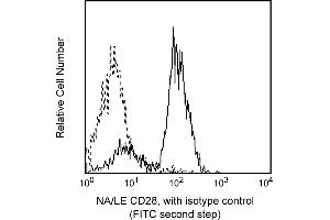 The CD28.2 monoclonal antibody specifically binds to CD28, a 44 kDa homodimeric transmembrane glycoprotein present on most mature T cells, thymocytes and plasma cells. CD28 is a costimulatory receptor that binds CD80 and CD86 as ligands and plays a very important role in T cell-B cell interactions. It has been suggested that CD28 initiates and regulates a separate and distinct signal transduction pathway from those stimulated by the TCR complex. Additionally, it has been reported that CD28 antibody clones vary in their ability to stimulate T cells to produce IL-2 and increase intracellular Ca2+ concentration. This finding suggests the existence of functionally distinct subregions on the CD28 molecule. CD28.2 has been demonstrated to bind to the same molecule as clone L293, another CD28 mAb, and has been reported to induce Ca2+ influx in Jurkat T cells.