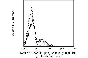 NKp46, a major cytoxicity receptor of NK cells, is a type I membrane glycoprotein (46 kDa) is expressed on resting and activated NK cells. Its extracellular region contains two C2-type, Ig-like domains. The transmembrane domain contains a positively charged amino acid (Arg) which could be involved in stabilizing the association with CD3zeta. Its intracellular region does not contain immunoreceptor tyrosine-based activating motifs (ITAM), but it is linked to intracytoplasmic transduction machinery by its association with CD3zeta and FcepsilonRIgamma adaptor proteins. NKp46 along with NKp30 and NKp44 are referred to as natural cytoxicity receptors (NCR) and play a very important role in killing virus-infected, tumor cells and MHC-class I-unprotected cells. This antibody is routinely tested by flow cytometric analysis.