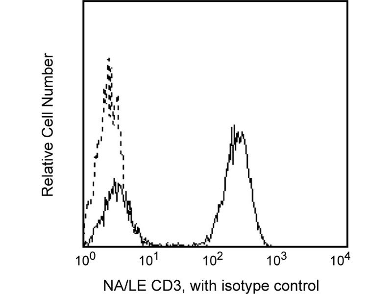 The UCHT1 monoclonal antibody specifically binds to the human CD3epsilon-chain, a 20-kDa subunit of the CD3/T cell antigen receptor complex. CD3epsilon is expressed on 70-80% of normal human peripheral blood lymphocytes and 60-85% of thymocytes. Studies from the HLDA Workshop show that this antibody is mitogenic for CD3epsilon-positive cells when used in conjunction with costimulatory agents such as pokeweed mitogen or anti-CD28 antibody. CD3 plays a central role in signal transduction during antigen recognition. The UCHT1 antibody stains both surface and intracellular CD3epsilon unlike the other CD3 clone, HIT3a, that stains only extracellular CD3epsilon.