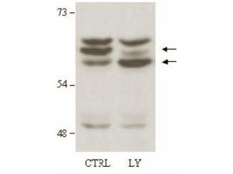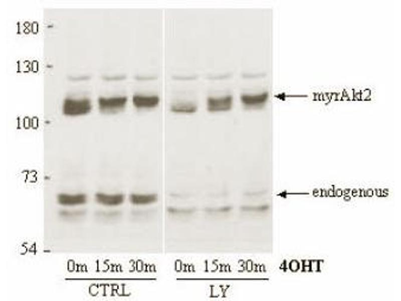 This antibody was tested by ELISA and Immunoblotting and was found to be reactive withboth unphosphorylated and phosphorylated AKT2 in a lysate of HEK293 cells. Although nottested, this antibody is likely functional in Immunohistochemistry andImmunoprecipitation. Recommended Dilution(s): This product has been assayed by immunoblot against aHEK293 cell lysate and is reactive at a 1: 1,000 dilution showing a band at approximately 60