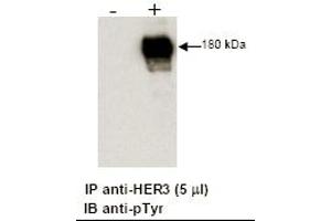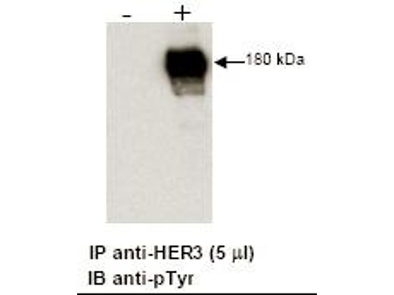 Anti-HER3 antibody is specifically designed for Immunoprecipitation and can be used forImmunoblotting in conjunction with a detection antibody like anti-phosphotyrosine. Reactivity in other assays is likely, but has not been determined. Recognition of HER3 isindependent of the phosphorylation status of the molecule. Human prostate cell lines(LNCap) or human breast cell line (MDA-453) are typically used as positive control sources. Recommended Dilutions: Immunoprecipitation: Use approximately 5 μL of the antibody. The Immunoprecipitation