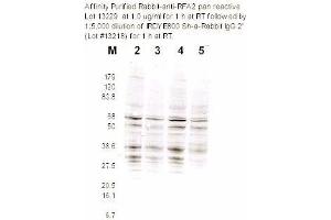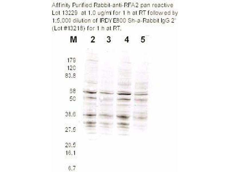 This affinity-purified antibody was tested for use in western blotting against RFA2containing cell lysates and by ELISA against the immunizing peptide. Reactivity in otherimmunoassays is unknown. This product was assayed by western blotting against RFA2containing cell lysates. A 1: 100 to 1: 500 dilution is recommended for this assay. Thisproduct was also assayed by ELISA against 0.1 μg of the phosphorylated andnonphosphorylated form of the immunizing peptide. A 1: 1,000 to 1: 3,000 dilution of theantibody is recommended against both forms of the peptide for this assay. Other applications not tested. Optimal dilutions are dependent on conditions and should be determined by the user.