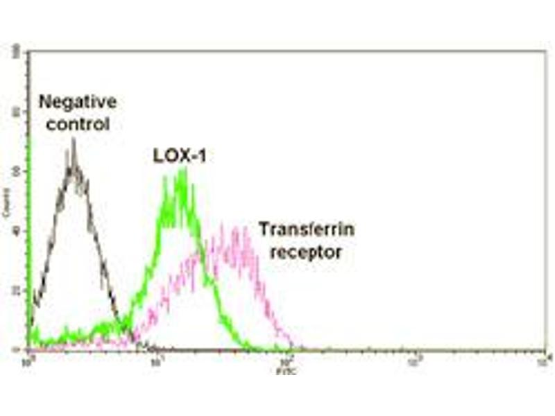 LOX-1 is a 40-50 kDa class E scavenger receptor, expressed by endothelial cells, macrophages, activated platelets and smooth muscle cells. LOX-1 binds to a wide range of ligands, including oxidized low-density lipoprotein (oxLDL), hypochlorite modified high-density lipoprotein (HDL), aged/apoptotic cells, activated platelets and bacteria, reflecting its versatile physiological functions. Expression of the LOX-1 gene is upregulated by oxLDL and the binding of LOX-1 to oxLDL results in the activation of NF-kappaB. Furthermore, LOX-1 antibodies have been shown to suppress the oxidized HDL (oxHDL) activation of NF-KappaB in endothelial cells, suggesting that this activation may be due to the binding of oxHDL to LOX-1. Angiotensin II and the inflammatory cytokine Tumour Necrosis Factor alpha (TNFalpha) also invoke an increase in LOX-1 gene expression and studies have focused on its role in endothelial dysfunction (1,4) and inflammatory diseases such as atherosclerosis (1) and rheumatoid arthritis, as well as its affect on CD40/CD40L signaling in both atherosclerosis and human coronary artery endothelial cells (HCAECs).Synonyms: C-type lectin domain family 8 member A, CLEC8A, LOX-1, Lectin-like oxidized LDL receptor 1, Lectin-type oxidized LDL receptor 1, Ox-LDL receptor 1, Ox-LDL receptor 1 soluble form, Oxidized low-density lipoprotein receptor 1, sLOX-1, sLOX1