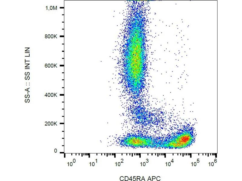 CD45RA is a high molecular weight isoform of a receptor-type protein tyrosine phosphatase, CD45 glycoprotein. CD45 is crucial in lymphocyte development and antigen signaling, serving as an important regulator of Src-family kinases, promotes cell survival by modulating integrin-mediated signal transduction pathway and is also involved in DNA fragmentation during apoptosis. CD45 isoforms differ in their extracellular domains, whereas they share identical transmembrane and cytoplasmic domains. These isoforms differ in their ability to translocate into the glycosphingolipid-enriched membrane domains and their expression depends on cell type and physiological state of the cell. CD45RA is expressed e.g. on naïve T cells and normal plasma cells.,PTPRCR, T200RA