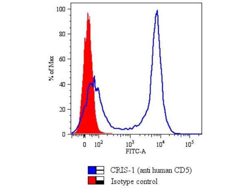 The mouse monoclonal antibody CRIS1 reacts with an extracellular epitope of CD5, a 67 kDa single-chain transmembrane glycoprotein expressed on mature T lymphocytes, most of thymocytes and B lymphocytes subset (B-1a lymphocytes).