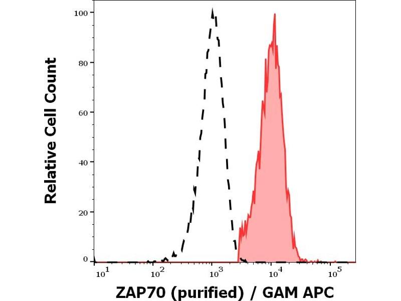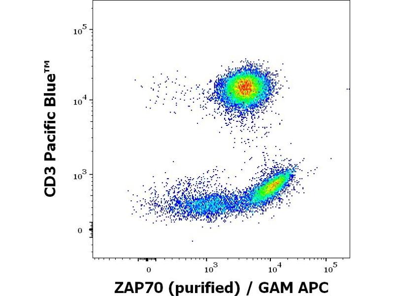 The antibody ZAP-03 reacts with ZAP70, a 70 kDa protein tyrosine kinase expressed in T and NK cells (intracellular antigen). ZAP70 is a molecule susceptible to degradation. It is recommended to use freshly prepared cell lysates (protease inhibitors are essential) to avoid non-specific staining of degradation products.