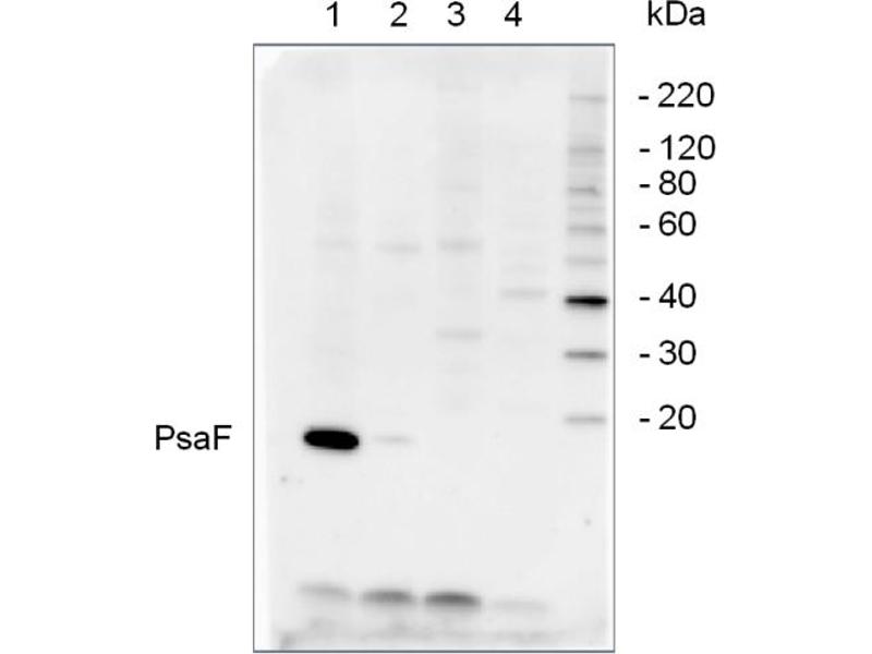 KLH-conjugated synthetic peptide derived from the PsaF protein sequence of Arabidopsis thaliana (At1g31330). This peptide sequence is not completely conserved in mono- and dicots.
