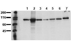 Western Blot: 0.5 μg/mL for HRPO/ECL detection. Recommended blocking buffer: Casein/Tween 20 based blocking and blot incubationbuffer. ELISA: 0.05 μg/mL. Immunoprecipitation: 1 - 10 μg per 10^6 vanadate treated A431 cells. Immunocytochemistry: 0.1-1 μg/mL. Immunohistochemistry on paraffin sections. Other applications not tested. Optimal dilutions are dependent on conditions and should be determined by the user.