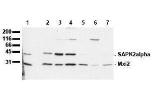 Mxi2 is a splice variant of SAPK2α (p38). Stress-activated protein kinases (SAPK) are strongly activated in response to adverse stimuli such as heat and osmotic shock, UV light and other DNA-damaging reagents, and inhibitors of protein synthesis. They are also activated strongly in response to agonists that are released or produced under conditions of stress, such as proinflammatory cytokines.Synonyms: CSBP, CSBP1, CSBP2, CSPB1, Cytokine suppressive anti-inflammatory drug-binding protein, MAX-interacting protein 2, MXI2, Mitogen-activated protein kinase 14, SAPK2A, p38 alpha