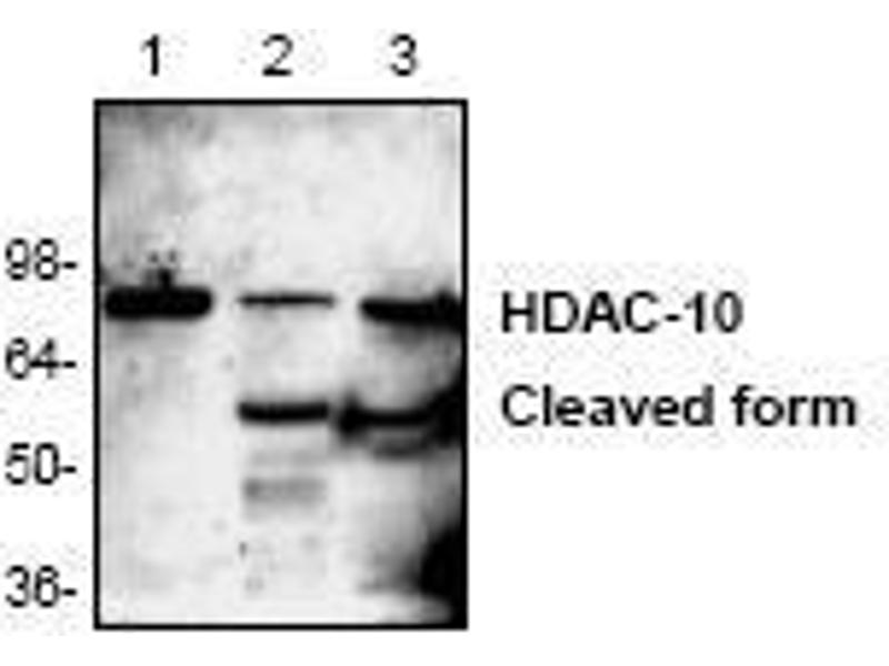 The antibody recognizes 74 kDa HDAC-10. A 55 kDa cleavage fragment can also be detected in mouse and rat tissue lysates.