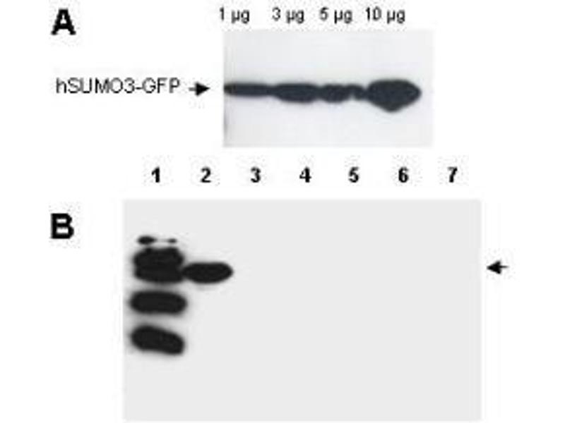 Immunogen: This purified antibody was prepared from rabbit serum after repeated immunizations with recombinant human SUMO-3 protein.