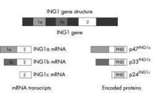 - Background: p33 ING1 is a tumor suppressor protein that can induce cell growth arrest and apoptosis. The encoded protein is a nuclear protein that physically interacts with the tumor suppressor protein TP53 and is a component of the p53-signaling pathway. Reduced expression and rearrangement of this gene have been detected in various cancers. Multiple alternatively spliced transcript variants encoding distinct isoforms have been reported. The accession number listed below is for variant (4) that encodes the longest isoform (D). Other synonyms for p33 ING1 include p33, p47, p33ING1, p24ING1c, p33ING1b, p47ING1a, growth inhibitor ING1, inhibitor of growth 1, tumor suppressor ING1 and growth inhibitory protein ING1.