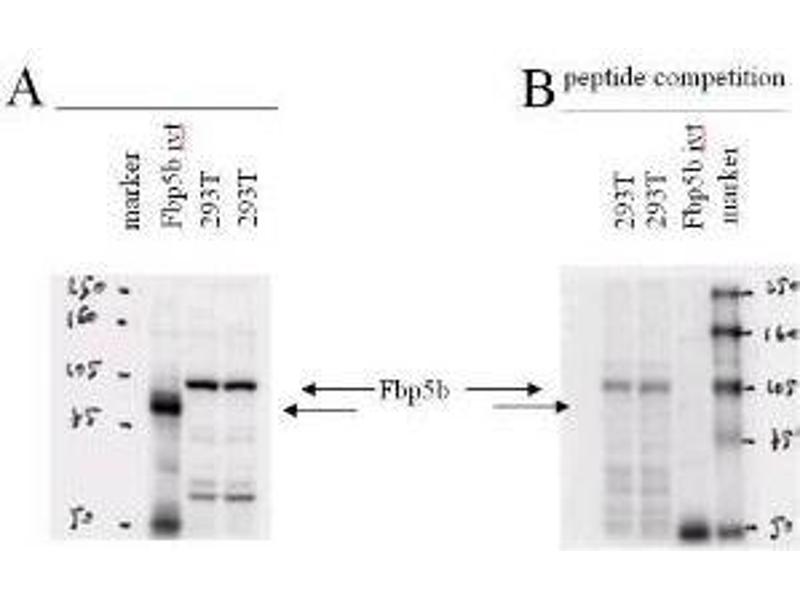 Immunogen: This affinity purified antibody was prepared from whole rabbit serum produced by repeated immunizations with a synthetic peptide corresponding to a region approximately 60 residues downstream of the amino terminal end of human Fbp5B protein. Human Fbp5B-2, 466 aa, predicted MW 51.3 kDa