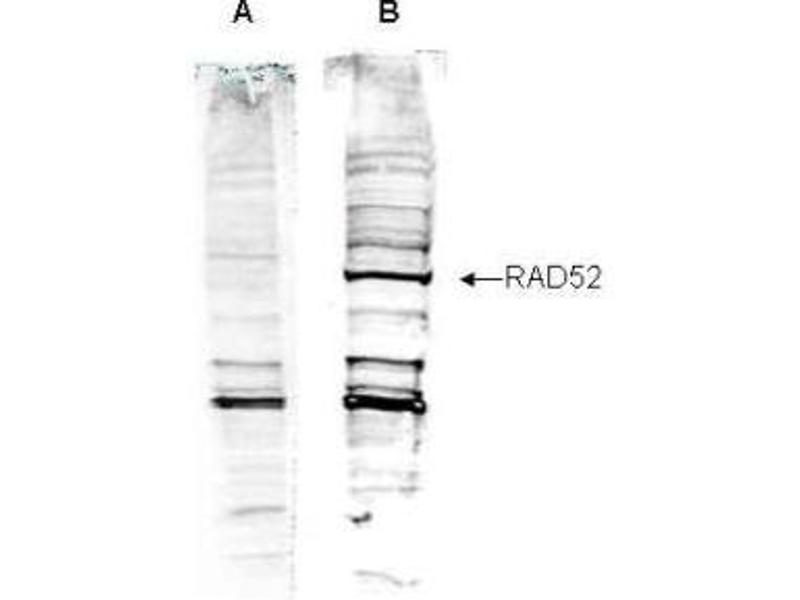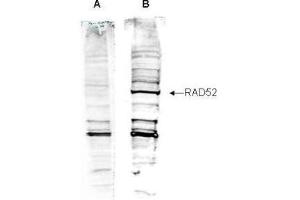 Immunogen: This affinity purified antibody was prepared from whole rabbit serum produced by repeated immunizations with a synthetic peptide corresponding to an internal region near aa 350-375 of the Human Rad 52 protein.