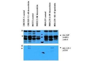 Application Note: This affinity purified antibody has been tested for use in ELISA, immunohistochemistry and by western blot. Specific conditions for reactivity should be optimized by the end user. Expect a band approximately 47 kDa in size corresponding to phosphorylated E2F-1 by western blotting in the appropriate cell lysate or extract. Less than 0.5 % reactivity is observed against the non-phosphorylated form of the immunizing peptide. This antibody is phospho specific for pS364 of E2F-1.