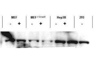 Application Note: This affinity purified antibody has been tested for use in ELISA, immunohistochemistry and by western blot.  Specific conditions for reactivity should be optimized by the end user. Expect a band approximately 48 kDa in size corresponding to Smad3 protein by western blotting in the appropriate stimulated tissue or cell lysate or extract.  This reagent reacts equally to phosphorylated and non-phosphorylated Smad3 by ELISA and western blotting.