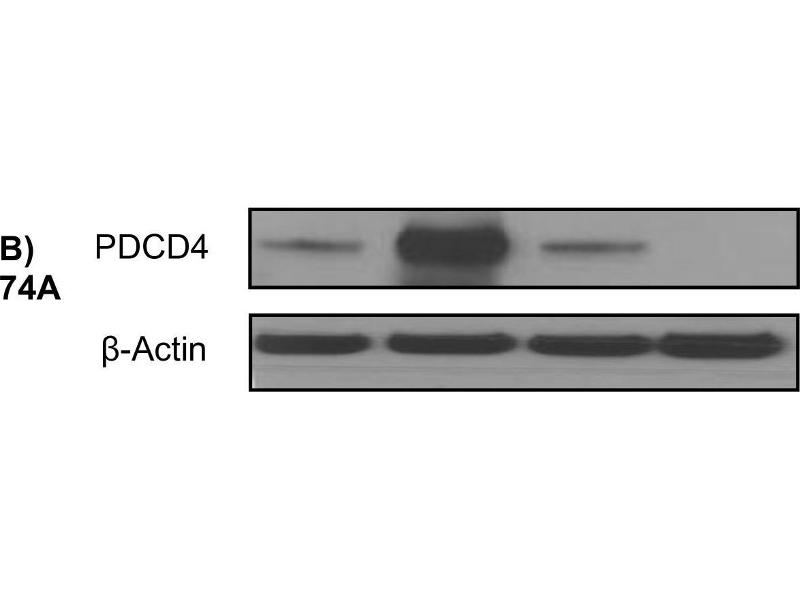 Background: This antibody is designed, produced, and validated as part of a collaboration with the National Cancer Institute (NCI) and is suitable for Cancer, Immunology and Nuclear Signaling research. Programmed cell death 4 (Pdcd4) is a novel tumor suppressor. Pdcd4 directly inhibits the helicase activity of eukaryotic translation initiation factor 4A (eIF4A), a component of the translation initiation complex. Pdcd4 also suppresses the transactivation of activator protein-1 (AP-1)-responsive promoters by c-Jun. Pdcd4 contains two Akt phosphorylation sites, one at Ser67 and the other at Ser457. The phosphorylation of Pdcd4 by Akt causes nuclear translocation of Pdcd4 and a significant decrease in the ability of Pdcd4 to interfere with the transactivation of AP-1-responsive promoters by c-Jun.