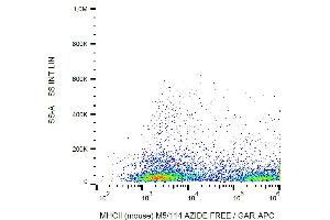 The rat monoclonal antibody M5/114 reacts with murine MHC class II glycoproteins. It recognizes a shared extracellular determinant on I-Ab, I-Ad, I-Aq, and I-Ed, I-Ek alloantigens, but it does not react with I-Af, I-Ak, I-As. This antibody can inhibit I-A-restricted T cell responses of the H-2b, H-2d, H-2q, H-2u but not H-2f, H-2k, H-2s haplotypes.