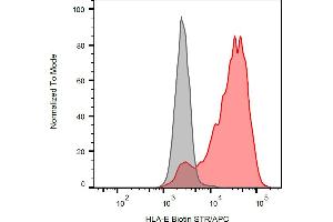 The antibody MEM-E/07 recognizes an extracellular epitope on native surface-expressed HLA-E, but not denaturated heavy chain of HLA-E. HLA-E belongs to the MHC Class I molecules (MHC Class Ib, nonclassical) and it is expressed on many types of the human cells. The published results revealed that the antibody cross-reacts with some classical MHC Class I molecules (MHC Class Ia): HLA-B7 (strongly), HLA-B8 (moderately), HLA-B27, -B44 (weakly).