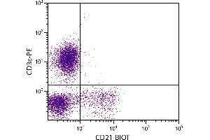 CD21, also known as complement receptor 2, is expressed on all mature circulating B lymphocytes but not on T lymphocytes or natural killer cells. Low density CD21 has also been reported on granulocytes and monocytes.
