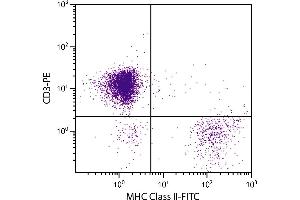 The chicken major histocompatibility complex (MHC), or B complex, consists of several clusters of highly polymorphic genes. Like their mammalian counterparts, the avian MHC exerts genetic influence over a variety of important biological functions such as immune response, disease resistance, growth and development, aging, and reproduction. Chicken MHC Class II genes, also known as the B-L subregion, of the chicken MHC encode cell surface glycoproteins that are homologous to mammalian Class II antigens. B-L antigens structurally are similar to mammalian Class II molecules in that they are noncovalently bound dimmers of one 32-34 kDa heavy chain and one 27-30 kDa light chain. MHC Class II is primarily expressed on B cells and antigen presenting cells (APCs).