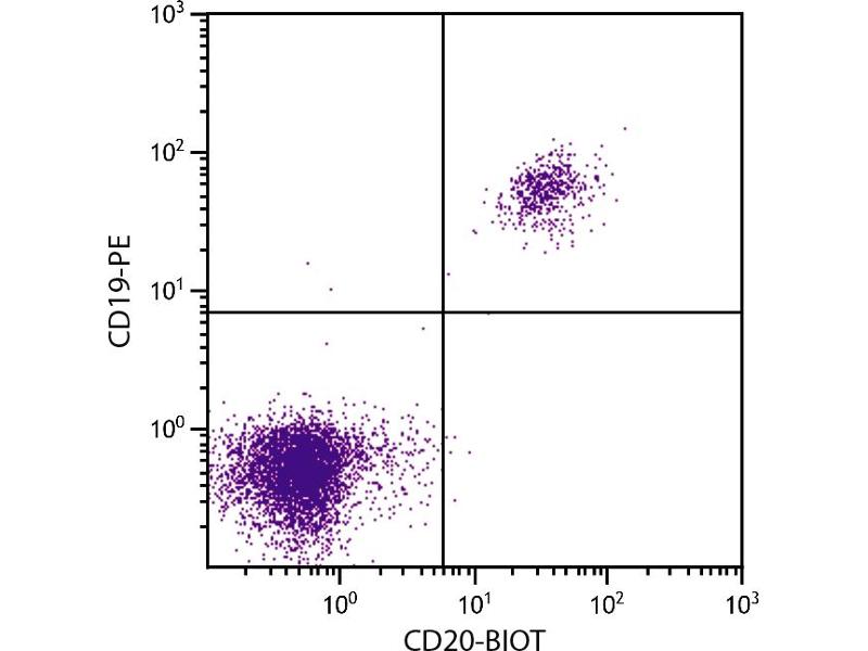 CD20 is a 33-37 kDa unglycosylated phosphoprotein. Although not a member of the tetraspanin superfamily of cell surface receptors, it crosses the cell membrane four times. It is expressed on all stages of B cell differentiation except plasma cells. The CD20 molecule is involved in regulation of B cell differentiation, presumably via its reported function as a Ca++ channel subunit.