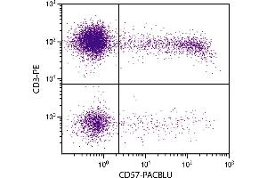 CD57 represents a 100 kDa oligosaccharide antigenic determinant present on a variety of polypeptides, lipids and chondroitan sulfate proteoglycans. It is expressed on 7-35 % of normal peripheral blood lymphocytes, including subsets of NK cells and CD8+ T lymphocytes. The function of CD57 is unknown.